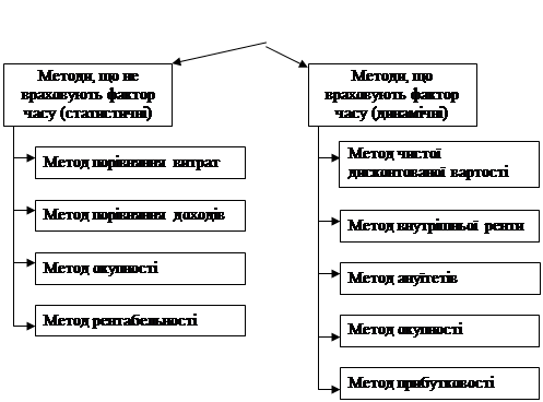 Рис. 3. Методи оцінки економічної ефективності інвестицій Статистичні методи традиційно використовуються в Україні. Вони базуються на усереднених характеристиках, які прив’язані до якогось проміжку часу. В результаті показники ефективності не враховують коливання параметрів інвестиції та можуть привести до неякісних рішень. Головним недоліком цих методів є відсутність врахування часу здійснення платежів.Динамічні методи були створені в країнах з розвинутою ринковою економікою. Вони забезпечують врахування фактору часу на цінність платежів за допомогою спеціального фінансово-математичного апарату. Метод чистої дисконтованої вартості (NPV). Засновано на приведені платежів (витрат і доходів) до одного періоду часу. Інвестиція є ефективною при вибраній відсотковій ставці на капітал, якщо NPV≥0. Оцінимо доцільність інвестування при відсотковій ставці у 10%. В даному випадку NPV розраховується при змінних поточних платежах за формулою: