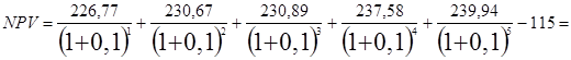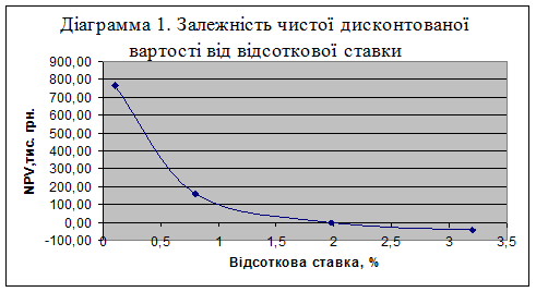 Рис. 4. Залежність чистої дисконтованої вартості від встановленого рівня дохідності і=10% – відсоткова ставка.