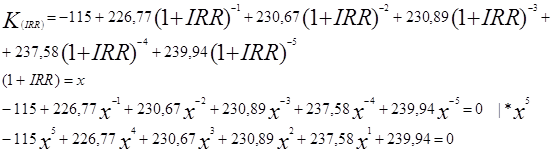 Отже дана інвестиція є ефективною при відсотковій ставці на капітал до 197,7%, оскільки при такій ставці NPV>0. Метод внутрішньої ренти (IRR). IRR – внутрішня рента (внутрішня норма рентабельності) характеризує величину дохода на капітал, при котрій настає межа ефективності. - розрахунок за допомогою функції ВСД у EXCEL: У EXCEL введемо чистий грошовий потік За допомогою „Вставка” - „Функція” - „Фінансові” – „ВСД” знайдемо значення внутрішньої ренти виділивши у строчці „Значення” масив чистого грошового потоку. Отримали IRR=197,707% - розрахунок IRR методом полінома: Вихідною умовою для розрахунку IRR є рівняння чистої дисконтованої вартості