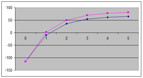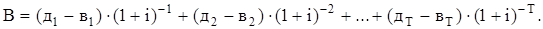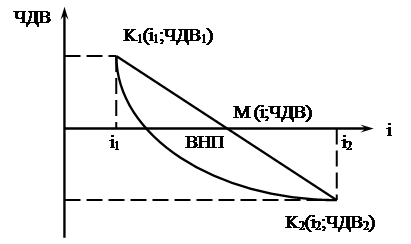 де:ЧДВ – чиста дисконтована вартість; д – поточні доходи від реалізації продукції чи послуг; в – поточні витрати на експлуатацію інвестиційного об'єкту; Дл – доходи від ліквідації інвестиційного об'єкту; В – витрати на створення інвестиційного об'єкту; n – тривалість використання інвестиційного об'єкту. При зростанні рівня відсоткової ставки інвестиція може перейти з категорії вигідних в категорію невигідних. Виходячи з динамічності відсоткової ставки в залежності від ситуації на ринку капіталу та умов фінансування проекту, можна вважати недоліком методу чистої дисконтованої вартості неоднозначність характеристики. Це наочно видно на графіку залежності (рис. 4).