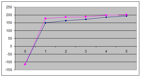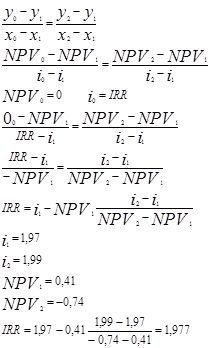 Рис. 5. Залежність чистої дисконтованої вартості від відсоткової ставки В результаті отримаємо формулу розрахунку внутрішньої норми прибутку: Рівняння хорди: