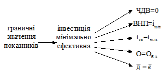 В якості граничних параметрів інвестиції можна розглядати показники приведені в таблиці 15. Таблиця 15. Параметри інвестиції, що обумовлюють граничний рівень ефективності