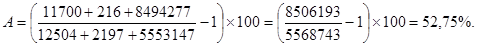 где: А – темп прироста реальных активов, С – основные средства и вложения без учета износа, торговой наценки по нереализованным товарам, нематериальных активов, использованной прибыли; З – запасы и затраты; Д – денежные средства, расчеты и прочие активы без учета использованных заемных средств; Индекс «0» - предыдущий год; Индекс «1» - отчетный год. Имеем: