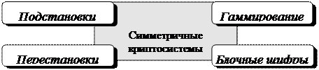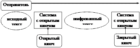 Рисунок 1. Подстановки Наиболее простой вид преобразований, заключающийся в замене символов исходного текста на другие (того же алфавита) по более или менее сложному правилу. Для обеспечения высокой криптостойкости требуется использование больших ключей. Например, подстановка Цезаря. Перестановки Также несложный метод криптографического преобразования. Используется как правило в сочетании с другими методами. Гаммирование Гаммирование является также широко применяемым криптографическим преобразованием. Принцип шифрования гаммированием заключается в генерации гаммы шифра с помощью датчика псевдослучайных чисел и наложении полученной гаммы на открытые данные обратимым образом (например, используя сложение по модулю 2). Процесс дешифрования данных сводится к повторной генерации гаммы шифра при известном ключе и наложении такой гаммы на зашифрованные данные. Полученный зашифрованный текст является достаточно трудным для раскрытия в том случае, если гамма шифра не содержит повторяющихся битовых последовательностей. По сути дела гамма шифра должна изменяться случайным образом для каждого шифруемого слова. Фактически же, если период гаммы превышает длину всего зашифрованного текста и неизвестна никакая часть исходного текста, то шифр можно раскрыть только прямым перебором (пробой на ключ). Криптостойкость в этом случае определяется размером ключа. Метод гаммирования становится бессильным, если злоумышленнику становится известен фрагмент исходного текста и соответствующая ему шифрограмма. 1.1.2.Системы с открытым ключом Как бы ни были сложны и надежны криптографические системы - их слабое мест при практической реализации - проблема распределения ключей . Для того, чтобы был возможен обмен конфиденциальной информацией между двумя субъектами ИС, ключ должен быть сгенерирован одним из них, а затем каким-то образом опять же в конфиденциальном порядке передан другому. Т.е. в общем случае для передачи ключа опять же требуется использование какой-то криптосистемы. Для решения этой проблемы на основе результатов, полученных классической и современной алгеброй, были предложены системы с открытым ключом. Суть их состоит в том, что каждым адресатом ИС генерируются два ключа, связанные между собой по определенному правилу. Один ключ объявляется открытым , а другой закрытым . Открытый ключ публикуется и доступен любому, кто желает послать сообщение адресату. Секретный ключ сохраняется в тайне. Исходный текст шифруется открытым ключом адресата и передается ему. Зашифрованный текст в принципе не может быть расшифрован тем же открытым ключом. Дешифрование сообщение возможно только с использованием закрытого ключа, который известен только самому адресату(рис.2).