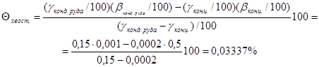 Если выходы продуктов неизвестны, но имеются данные о составе, например, исходной руды, концентрата и хвостов, то, используя выражения (3) и (5) или (4) и (5), легко получить выражения для расчёта величины извлечения интересующего компонента руды соответственно в концентрат Суммарное извлечение данного компонента во все полученные продукты переработки и обогащения руды составляет 100%: