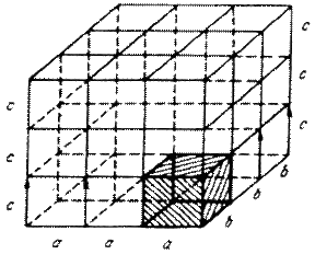Рис. 2.1. Кристаллическая решетка В кристалле элементарные частицы (атомы, ионы) сближены до соприкосновения. Для упрощения пространственное изображение принято заменять схемами, где центры тяжести частиц представлены точками. В точках пересечения прямых линий располагаются атомы; они называются узлами решетки. Расстояния a, b и c между центрами атомов, находящихся в соседних узлах решетки, называют параметрами, или периодами решетки. Величина их в металлах порядка 0,1–0,7 нм, размеры элементарных ячеек — 0,2–0,3 нм. Для однозначного описания элементарной ячейки кристаллической решетки необходимо знание величин параметров a, b, c и углов между ними. В 1848 г. французский ученый Бравэ показал, что изученные трансляционные структуры и элементы симметрии позволяют выделить 14 типов кристаллических решеток. На рис. 2.2 показаны три типа элементарных ячеек кристаллических решеток, наиболее характерные для металлов: объемноцентрированная кубическая (ОЦК); гранецентрированная кубическая (ГЦК) и гексагональная плотноупакованная (ГП), а также схемы упаковки в них атомов. .