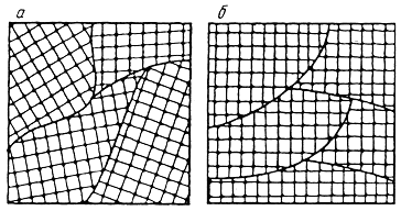 (a-Ti « g-Ti) и других элементов. Рис. 3.1. Схема определения базиса ОЦК решетки Температура превращения одной кристаллической модификации в другую называется температурой полиморфного превращения. При полиморфном превращении меняются форма и тип кристаллической решетки. Это явление называется перекристаллизацией. Так, при температуре ниже 911 °С устойчиво Fea, в интервале 911–1392 °С устойчиво Feg. При нагреве выше 911 °С атомы решетки ОЦК перестраиваются, образуя решетку ГЦК. На явлении полиморфизма основана термическая обработка. При переходе из одной полиморфной формы в другую меняются свойства, в частности плотность и соответственно объем вещества. Например, плотность Feg на 3 % больше плотности Fea, а удельный объем соответственно меньше. Эти изменения объема необходимо учитывать при термообработке. Полиморфизм олова явился одной из причин гибели полярной экспедиции английского исследователя Р. Скотта. Оловом были запаяны канистры с керосином. При низкой температуре произошло полиморфное превращение пластичного белого олова с образованием хрупкого порошка серого олова. Горючее вылилось и испарилось, и на обратном пути экспедиция осталась без топлива. Превращение белого олова в серое называют «оловянной чумой». Свойства материалов зависят от природы атомов, из которых они состоят, и силы взаимодействия между ними. Аморфные материалы характеризуются хаотическим расположением атомов. Поэтому свойства их в различных направлениях одинаковы, или, другими словами, аморфные материалы изотропны. В кристаллических материалах расстояния между атомами в разных кристаллографических направлениях различны. Например, в ОЦК решетке в кристаллографической плоскости, проходящей через грань куба, находится всего один атом, так как четыре атома в вершинах одновременно принадлежат четырем соседним элементарным ячейкам: (1/4) 4 = 1 атом. В то же время в плоскости, проходящей через диагональ куба, будут находиться два атома: 1 + (1/4) 4 = 2. Из-за неодинаковой плотности атомов в различных направлениях кристалла наблюдаются разные свойства. Различие свойств в кристалле в зависимости от направления испытания называется анизотропией. Разница в физико-химических и механических свойствах в разных направлениях может быть весьма существенной. При измерении в двух взаимно перпендикулярных направлениях кристалла цинка значения температурного коэффициента линейного расширения различаются в 3–4 раза, а прочности кристалла железа — более чем в два раза. Анизотропия свойств характерна для одиночных кристаллов или для так называемых монокристаллов. Большинство же технических литых металлов, затвердевших в обычных условиях, имеют поликристаллическое строение. Они состоят из большого числа кристаллов или зерен (рис. 3.2, а). При этом каждое отдельное зерно анизотропно. Различная ориентировка отдельных зерен приводит к тому, что в целом свойства поликристаллического металла являются усредненными. Поликристаллическое тело характеризуется квазиизотропностью — кажущейся независимостью свойств от направления испытания. Квазиизотропность сохраняется в литом состоянии, а при обработке давлением (прокатке, ковке), особенно, если она ведется без нагрева, большинство зерен металла приобретает примерно одинаковую ориентировку — так называемую текстуру (pиc. 3.2