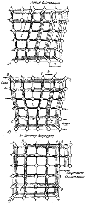 Рис. 4.4. Схема пластической деформации путем последовательного перемещения дислокации в простой кубической решетке: а) исходное состояние краевой дислокации б) контур Бюргерса вокруг дислокации; в) контур Бюргерса для неискаженной решетки после скольжения Пластический сдвиг является следствием постепенного перемещения дислокаций в плоскости сдвига. Распространение скольжения по плоскости скольжения происходит последовательно. Каждый элементарный акт перемещения дислокации из одного положения в другое совершается путем разрыва лишь одной вертикальной атомной плоскости. Для перемещения дислокаций требуется значительно меньшее усилие, чем для жесткого смещения одной части кристалла относительно другой в плоскости сдвига. При движении дислокации вдоль направления сдвига через весь кристалл происходит смещение верхней и нижней его частей лишь на одно межатомное расстояние. В результате перемещения дислокация выходит на поверхность кристалла и исчезает. На поверхности остается ступенька скольжения. В лекции о роли дислокаций Орован в качестве аналогии движения дислокаций приводил примеры перемещения таких представителей животного мира, как дождевой червь или змея. Они скользят по поверхности земли, последовательно перемещая участки своего тела. При этом участки, через которые прошла волна возмущения, восстанавливают исходную форму. В случае пластического сдвига позади переместившейся дислокации атомная структура верхних и нижних слоев восстанавливает свою исходную конфигурацию.