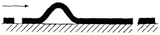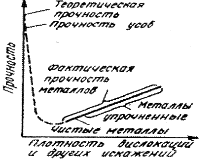 Другой аналогией движения дислокаций является перемещение складки на ковре. Последовательное перемещение складки потребует значительно меньше усилий, чем перемещение всего ковра по поверхности пола, хотя в обоих случаях будет достигнут один и тот же результат — ковер переместится на одинаковое расстояние (рис. 4.5). Рис. 4.5. Схема движения дислокации по аналогии с перемещением складки на ковре Дислокации легко перемещаются в направлении, перпендикулярном экстраплоскости. Чем легче перемешаются дислокации, тем ниже прочность металла, тем легче идет пластическая деформация. Пластическая деформация кристаллических тел связана с количеством дислокаций, их шириной, подвижностью, степенью взаимодействия с дефектами решетки и т. д. Характер связи между атомами влияет на пластичность кристаллов. Так, в неметаллах с их жесткими направленными связями дислокации очень узкие, они требуют больших напряжений для старта — в 103 раз больших, чем для металлов. В результате хрупкое разрушение в неметаллах наступает раньше, чем сдвиг. Таким образом, причиной низкой прочности реальных металлов является наличие в структуре материала дислокаций и других несовершенств кристаллического строения. Получение бездислокационных кристаллов приводит к резкому повышению прочности материалов (рис. 4.6).