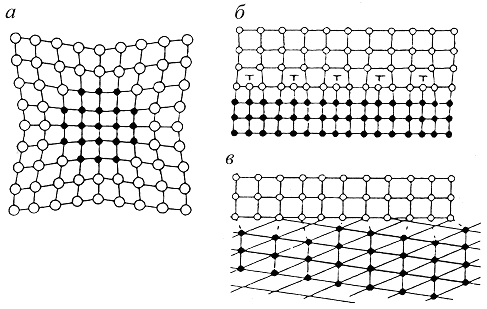 Рис. 4.8. Схема межфазных границ: а) когерентные; б) полукогерентные; в) некогерентные