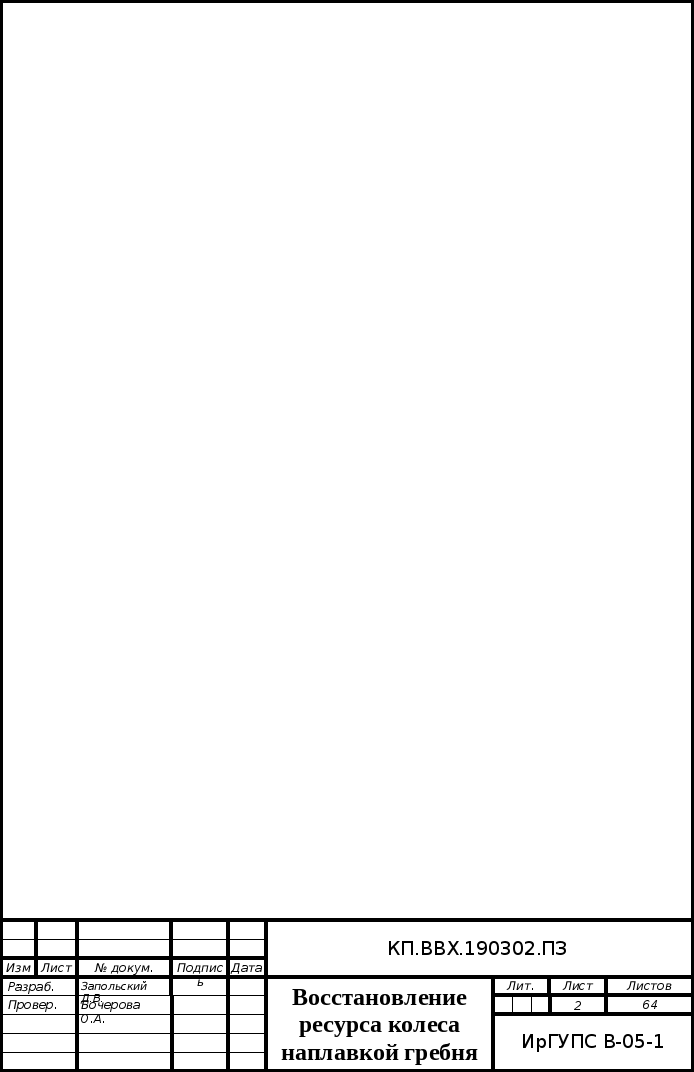 СПИСОК ИСПОЛЬЗОВАННОЙ ЛИТЕРАТУРЫГОСТ 2246 – 70 Проволока стальная сварочная. Технические условия ГОСТ 9036 – 88 Колёса цельнокатаные. Конструкция и размеры ГОСТ 9087 – 81 Флюсы сварочные плавленые. Технические условия ГОСТ 10791 – 2004 Колёса цельнокатаные. Технические условия Правила технической эксплуатации железных дорог ЦРБ-756. М.: Техинформ, 2000, – 190 с. Инструкция по сварке и наплавке при ремонте грузовых вагонов ЦВ 201-98. М.: Транспорт, 1999 г. - 256 с. Унифицированная технологическая инструкция по автоматической наплавке под флюсом гребней вагонных колесных пар. ТИ-5-02-02У.01.04.2004г., Москва. Богданов А.Ф.,Чурсин В.Г. Эксплуатация и ремонт колесных пар вагонов. – М.: Транспорт, 1985. – 270 с. Лукин В.В., Анисимов П.С., Федосеев Ю. П. Вагоны. Общий курс: Учебник для вузов ж.-д. трансп./Под ред. В.В. Лукина. – М.:Маршрут, 2004.- 424с. Методические указания к курсовому проекту по дисциплине «Технология производства и ремонта вагонов» для студентов четвертого курса специальности «Вагоны». Сост. Г. С. Пугачёв, Иркутск, ИрИИТ, 2002, - 38 с. Методические указания к курсовой работе по дисциплине «Технология сварочного производства на вагоноремонтном предприятии» для студентов специальности 150800. Сост. Н. О. Тютрин, Иркутск, ИрГУПС, 2003, - 48 с. Пугачёв Г.С. Технология сварочного производства на вагоноремонтных предприятиях: Учебное пособие. - Иркутск: ИрИИТ, 2001. - 85 с. Технология вагоностроения и ремонта/ Под ред. В.С. Герасимова – 2-е изд., перераб. и доп.- М.: Транспорт, 1988.- 381 с. СОДЕРЖАНИЕ Введение………………………………………………………………...........4 Характеристика конструкции………………………………………...6 Назначение узла…………………………………………………6 Описание конструкции………………………………………….8 Описание взаимодействия деталей колёсной пары под действием эксплуатационных и других нагрузок……………..9 Характеристика материала колёс…………………………….11 Силовые факторы, действующие на колесную пару, вызывающие ее повреждение…………………………………13 Анализ повреждений и неисправностей…………………………...14 Статистика отказов колёсных пар в эксплуатации…………..14 Виды повреждений…………………………………………….15 Допускаемое значение величин……………………………….17 Причины повреждения………………………………………...18 Мероприятия, направленные на повышение работоспособности и долговечности…………………………19 Анализ существующих методов ремонта и обоснование выбранного метода ………………………………………………….2 Технология наплавки гребней колес……………………………….30 Технологический процесс наплавки колёс…………………...30 Технологическое оборудование и оснастка…………………..34 Сварочные материалы………………………………43 Расчет параметров процесса наплавки……………………45 Расчет норм времени………………………………………...49 Метрологическое обеспечение проекта……………………53 Маркировка и регистрация наплавленных колес…………56 Технико-экономическая оценка проекта…………………………57 Мероприятия по технике безопасности и охране труда…………62 Список используемой литературы…………………………………….......64 Федеральное Агентство Железнодорожного Транспорта Иркутский Государственный Университет Путей Сообщения Кафедра ″ВВХ″ Курсовой проект по дисциплине «Технология производства и ремонта вагонов» ТЕМА: ВОССТАНОВЛЕНИЕ РЕСУРСА КОЛЕСА НАПЛАВКОЙ ГРЕБНЯ КП.ВВХ.190302.ПЗ Выполнил студент группы В-05-1 Запольский Д. В. Руководител
