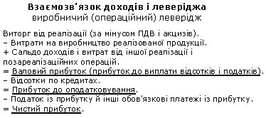 Мал. 1.2 Схема взаємозв'язку доходів і леверіджа. Виробничий (операційний) леверідж - це потенційна можливість впливати на валовий прибуток шляхом зміни структури собівартості й об'єму випуску продукції. Дія операційного важеля (леверіджа) виявляється в тому, що будь-яка зміна виторгу від продажу продукції завжди породжує значну зміну прибутку. Цей ефект обумовлений різним ступенем впливу динаміки постійних і перемінних витрат на формування фінансових результатів при зміні об'єму виробництва. Чим вище рівень постійних витрат, тим більше сила впливу операційного важеля. Сила впливу операційного важеля інформує про рівень підприємницького ризику. Сила впливу операційного важеля розраховується як відношення маржінального доходу до прибутку і показує, скільки відсотків зміни прибутку дає кожен відсоток зміни виторгу від реалізації; визначається по формулі: Свов = МД / П, де Свов - сила впливу операційного важеля; МД - маржінальний доход; П - прибуток. Керівництво підприємства "Технологія" має намір за рахунок росту об'ємів продажів електротоварів збільшити виторг від реалізації на 10% (з 50 000 грн. до 55 000 грн.), не виходячи при цьому за межі релевантного періоду. Загальні змінні витрати складають для початкового варіанта 36 000 грн. Постійні витрати дорівнюють 4 000 грн. Можна розрахувати суму прибутку відповідно до нового розміру виручки від реалізації продукції традиційним методом чи за допомогою операційного важеля. Традиційний метод: 1. Початковий прибуток дорівнює 10 000 грн. (50 000 - 36 000 - 4 000). 2. Змінні витрати на запланований об'єм продукції зростуть на 10%, тобто будуть рівні 39 600 грн. (36 000 х 1,1). 3. Новий прибуток: 55 000 - 39 600 - 4 000 = 11 400 грн. Метод операційного важеля: 1. Сила впливу операційного важеля: (50 000 - 36 000 / / 10 000) = 1,4. Це означає, що 10% росту виторгу повинні принести приріст прибутку на 14% (10 х 1,4), тобто 10 000 х 0,14=1 400 грн. Виходить, маємо однакові результати, використовуючи обидва методи. Сила впливу операційного важеля, як відомо, залежить від величини постійних витрат. Для підприємств, перевантажених громіздкими виробничими фондами, високий рівень операційного важеля являє значну загрозу: в умовах економічної нестабільності, падіння купівельної спроможності клієнтів і досить високої інфляції кожен відсоток зниження виторгу може обернутися катастрофічним падінням прибутку й входженням підприємства в зону збитків. Менеджмент такого підприємства є заблокованим, тобто позбавленим варіантів вибору продуктивних рішень. Але все-таки існує вихід: сьогодні консалтингові центри Української Консалтингової Мережі пропонують курс "Антикризове керування підприємством", опанувавши яким фінансові менеджери зможуть знайти рішення щодо виходу підприємства з кризи. Цей курс був з успіхом випробуваний у Хмельницькому Чернівецьким бізнес-центрами і Хмельницьким Консалтинговим Центром "Інфо-Лайн". Навчання проходили представники великих промислових підприємств Хмельницького, які знаходяться зараз у несприятливому фінансовому положенні. У результаті навчання вони одержали цінні знання й навички для вирішення конкретних проблем на своїх підприємствах. Фінансовий леверідж - це інструмент, який впливає на прибуток підприємства шляхом зміни структури й об'ємів довгострокових пасивів. Дія фінансового важеля полягає в тому, що підприємство, яке вико