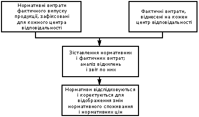 Мал. 1.5 Облік відповідальності на основі нормативних витрат. Існує п'ять основних типів нормативів: · "Базові" стандарти - не коректуються після їхнього визначення, якщо не відбувається істотних змін у технічних характеристиках продукції чи процесі виробництва; · "Поточні" стандарти - визначають величину витрат коштів для даного періоду часу. Передбачають постійне коректування на основі зміни технічних умов, цін і тарифів; · "Ідеальні" стандарти - містять у собі нормативи тільки тих елементів витрат і на тім рівні, що приймаються й виникають в оптимальних умовах виробництва при найбільш сприятливих цінах; · "Мотивуючі" стандарти - їх можна витримувати, якщо докладати розумних зусиль у нормальних виробничих умовах. Такі нормативи повинні давати можливість "напружуватися". · "Реальні" стандарти - визначають нормативні витрати, які можна чекати при даних імовірних умовах функціонування виробництва. Процес підготовки основного бюджету підприємства можна розділити на дві частини: складання операційного бюджету і фінансового бюджету. А вони, у свою чергу, складаються з безлічі функціональних бюджетів, що дають можливість відслідковувати стан справ у всіх підрозділах. Основні з функціональних бюджетів наступні: · Бюджет продажів. Містить інформацію про запланований об'єм продажів, ціну й очікуваний доход від реалізації кожного виду продукції. Центром відповідальності є відділ маркетингу. Фактори, які впливають на прогнозування цього бюджету наступні: об'єм продажів минулих періодів, виробничі потужності, залежність від загальноекономічних показників, відносна прибутковість ринку, рекламна кампанія, цінова політика, конкуренція, сезонні коливання і тощо. · Бюджет виробництва. Це виробнича програма, яка визначає заплановану номенклатуру й об'єм виробництва продукції у бюджетному періоді. Для прогнозування цього бюджету використовується формула: Об'єм виробництва = Об'єм продажів + необхідний запас готової продукції на кінець періоду - запас готової продукції на початок періоду. · Бюджет витрат на оплату праці. Плановий документ, у якому визначаються витрати на оплату праці, необхідні для виробництва товарів чи послуг за бюджетний період. Він підготовляється виходячи з бюджету виробництва, даних щодо продуктивності праці й ставок оплати праці основного виробничого персоналу. · Бюджет виробничих накладних витрат. Визначає накладні витрати, пов'язані з виробництвом продукції чи послуг у бюджетному періоді. У ньому прогнозується об'єм усіх витрат, пов'язаних з виробництвом продукції, за винятком витрат на прямі матеріали й витрат на оплату праці. · Бюджет витрат на реалізацію й управління. Документ, у якому приводяться витрати, пов'язані зі збутом продукції у бюджетному періоді. Він прогнозує очікувані витрати на керування й обслуговування підприємства в цілому. · Бюджетний звіт про прибуток. Це форма фінансової звітності, що складається до початку планового періоду і відбиває результат планованої діяльності. Він складається для того, щоб врахувати виплати податку на прибуток у грошовому потоці. · Бюджет коштів. Плановий документ, що відбиває майбутні платежі й надходження грошей. Цей бюджет зводить усі негативні й позитивні грошові потоки й обов'язково враховує використання позикових фінансових коштів за умови негати