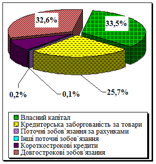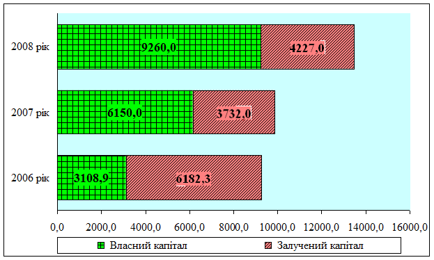 Залучені кошти ТОВ «Ареал» у 2006-2008 роках, навпаки, мали тенденцію стабільного скорочення: у 2007 році вони скоротилися, у порівнянні з 2006 роком, в 1,7 рази і склали 3732,0 тис. грн, на кінець 2008 року, по відношенню до 2006 року, вони зменшилися в 1,5 рази, або на 1955,3 тис. грн і склали 4227,0 тис. грн. Відповідно змінювалась структура залучених коштів, але при цьому, упродовж трьох років, вони мали значну питому вагу в структурі капіталу підприємства (66,5% - 31,3%). Найбільшу питому вагу в залучених коштах 2006 року складали довгострокові зобов`язання (32,6%), в останні два роки довгострокові зобов’язання у складі залучених коштів на було. Кредиторська заборгованість ТОВ «Ареал» перед постачальниками за товари, роботи, послуги на кінець 2008 року, у порівнянні з 2006 роком, зросла у 1,7 рази і склала 4085,0 тис грн. У 2008 році, у порівнянні з 2006 роком, збільшились поточні зобов`язання за розрахунками у 12,4 рази з 7,6 тис. грн до 94,0 тис.грн. Цьому сприяло зростання заборгованості по розрахунках з бюджетом на 44,7%, заборгованості по оплаті праці працівникам підприємства та страхуванню, якої у 2006 році не було (на кінець 2008 року вона склала 83,0 тис. грн). Залучення позикових коштів в оборот ТОВ «Ареал» — нормальне явище. Це сприяє тимчасовому поліпшенню фінансового стану за умови, що засоби не заморожуються на тривалий час в обороті і своєчасно повертаються. На кінець 2008 року довгострокові зобов’язання підприємством були погашені, що свідчить про виважену фінансову політику на підприємстві. Отже, розумні розміри позичкового капіталу здатні поліпшити фінансовий стан ТОВ «Ареал», а надмірні - погіршити його. Оцінка змін, які відбулися в структурі капіталу ТОВ «Ареал» за 2006-2008 роки, може бути різною з позиції інвесторів і з позиції самого підприємства. Для банків і інших інвесторів ситуація надійніша, якщо частка власного капіталу у клієнта більше 50% (в ТОВ «Ареал»в останні 2 роки вона складає понад 60%). Це виключає фінансовий ризик. Але, як видно з даних таблиці 2.4, ТОВ «Ареал» зацікавлене в залученні позикових засобів (короткострокових кредитів банків). Графік динаміки зміни власного і залученого капіталу ТОВ «Ареал» за 2006-2008 роки наведен на рисунку 2.6.