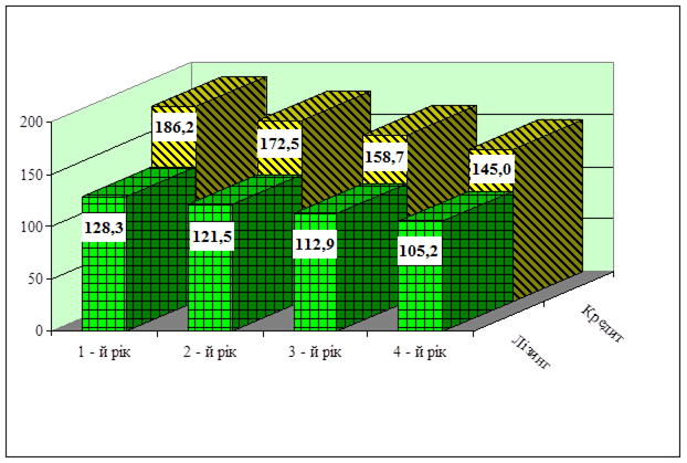 Примітка. 55,0 тис. грн. - амортизаційні відрахування, розраховані на підставі норми амортизаційних відрахувань на повне відновлення обладнання, тис. грн. Для визначення загального розміру лізингового платежу проведемо наступні розрахунки: 1. Розрахунок величини плати за користування кредитними ресурсами [37]: Пк р = [ (Сн + Ск) / 2] : 100%,(3.2) де Пкр - плата за користування кредитними ресурсами; Сн - вартість обладнання на початок року; Ск - вартість обладнання на кінець року. Зробимо розрахунки: Пкр1 = [(550+495):2]:100% = 52,25 тис.грн. Пкр2 = [(495+440):2]:100% = 46,75 тис.грн. Пкр3 = [(440+385):2]:100% = 41,25 тис.грн. Пкр4 = [(385+330):2]:100% = 35,75 тис.грн. 2. Розрахунок розміру комісійних виплат [37]: Пком = [ (Сн + Ск) / 2] * Ском / 100%, (3.3) де Пком - плата по комісії; Ском - ставка комісійних виплат. Зробимо розрахунки: Пком1 = 522,5*4%:100% = 20,90 тис.грн. Пком2 = 467,5*4%:100% = 18,70 тис.грн. Пком3 = 412,5*4%:100% = 16,50 тис.грн. Пком4 = 357,5*4%:100% = 14,30 тис.грн. 3. Розрахунок розміру додаткових послуг лізингодавця [37]: Пу = Рком + Ру + Ре, (3.4) де Пу - плата за послуги лізингодавця; Рком - відряджувальні видатки робітників лізингодавця; Ру - видатки на надання юридичних консультацій з питань укладення лізингової угоди; Ре - видатки лізингодавця (ТОВ «Райффайзен Лізинг Аваль») на консультації по експлуатації вантажних автомобілів, включаючи організацію спробних іспитів. Зробимо розрахунки: Пу = 0,16+0,15+0,25= 0,56 тис. грн. Щорічний розмір додаткових послуг лізингодавця складатиме: Пу1-4 = [ 0,16+0,15+0,25] : 4 = 0,14 тис. грн. 4. Розрахунок загальної суми виплат лізингодавцю по лізинговій угоді [37]: ЛП=А+Пкр+Пком+Пу, (3.5) де ЛП - загальна сума лізингових платежів; А - амортизаційні відрахування. Зробимо розрахунки: ЛП1= 55,0+52,25+20,9+0,14 = 128,29 тис.грн. ЛП2 = 55,0+47,65+18,7+0,14 = 121,49 тис.грн. ЛП3 = 55,0+41,25+16,5+0,14 = 112,89 тис.грн. ЛП4 = 55,0+35,75+14,3+0,14 = 105,19 тис.грн. Розрахунки загального розміру лізингового платежу по рокам зведені в таблицю 3.4. Таблиця 3.4 Розрахунок загального розміру лізингового платежу інвестиційного проекту ТОВ «Ареал», тис. грн.