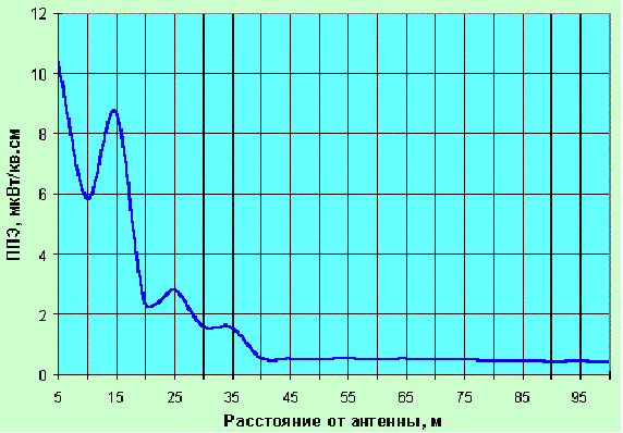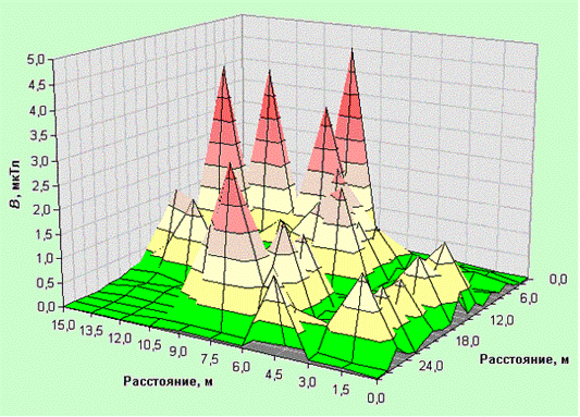 Рис. 13. Изменение уровня магнитного поля промышленной частоты В табл. 3 представлены данные о расстоянии, на котором фиксируется магнитное поле промышленной частоты (50 Гц) величиной 0,2 мкТл при работе ряда бытовых приборов. Таблица 3 Распространение магнитного поля промышленной частоты от бытовых электрических приборов (выше уровня 0,2 мкТл)