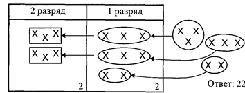В этом случае единицы каждого разряда имели свои обозначения: единицы первого разряда обозначались крестиком, второго - квадратиком, третьего - кружочком и т.д. Дети, как и в первом случае, использовали руку: считали крестики, выделяли тройки, но вместо переноса их в соответствующий разряд они обводили их, рисовали стрелку в соответствующем направлении, давали обозначение разряда'.