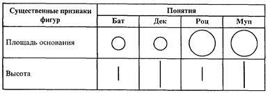 Как видим, дети сразу усваивают целую систему понятий, в данном случае - искусственных (бат, дек, роц, муп), которые были рассмотрены нами при анализе обобщенности действия. Каждое понятие характеризуется двумя существенными признаками: величина площади основания и высоты. Дети имеют мерки, по которым определяют, большая или маленькая площадь (высота). Меркой для площади служит монетка. Если фигурка умещается на монетку, значит, «донышко» (основание) маленькое, если не умещается - «донышко» большое. Эталоном высоты служит спичка: если «рост» меньше или равен спичке - фигурка низкая, у нее «маленький рост»; если высота превосходит спичку - высокая, у нее «большой рост». Во второй табличке представлено логическое правило распознавания в развернутом виде, где предусмотрены все сочетания признаков, с которыми встретится ребенок в процессе работы. Слишком долго задерживать учащихся на этапе внешних практических действий не следует. Как только они научились их выполнять правильно, надо действия переводить в теоретическую форму: учить обучаемых оперировать признаками понятия и логическим правилом без опоры на внешние предметы и без практического выполнения операций руками. Этап внешнеречевых действий. Работа идет в том же порядке. Но теперь ученики называют признаки по памяти. Для анализа им теперь уже даются не предметы и модели, а их описания. Так, если мы продолжим работу с понятием перпендикулярные прямые, то на этапе внешнеречевых действий учащимся можно предложить задания такого типа: «Даны две пересекающиеся прямые. Будут ли они перпендикулярными?» К задаче не дается ни чертежа, ни модели. Учащиеся учатся теперь анализировать словесные условия. Они читают (или слушают) и выделяют то, что касается первого признака. Если задание дано в письменном виде, то учащиеся должны подчеркнуть слова «две пересекающиеся прямые» и поставить знак того, что первый признак имеется: «I. +». Таким же образом идет работа со вторым признаком. После этого учащиеся определяют, что же у них получилось: первый признак есть, второй признак не известен. Результаты работы с признаками фиксируются обычно на бумаге, но могут и просто называться. Для оценки полученных результатов учащиеся теперь уже вспоминают логическое правило подведения, доказывают верность своего ответа. Аналогичным образом учащиеся выполняют еще несколько заданий, на которых и учатся рассуждать вслух, доказывать, что их ответ правильный. При этом они все время опираются именно на те свойства предметов, которые существенны для понятия. При таком обучении у всех учащихся формируется умение выделять в предметах существенные свойства и на их основе решать, подходят предметы под данное понятие или не подходят. Еще раз подчеркнем, что учащиеся должны не только работать с заданиями, имеющими положительный или отрицательный ответ, но анализировать также и задания с неопределенным ответом. Это означает, что действие пройдет дальнейшее обобщение. В начале данного этапа действие должно быть полностью развернуто, так как ученик должен научиться выполнять все операции в новой для него форме - речевой. В конце этого этапа возможно сокращение действия. Наконец, когда учащийся освоит деятельность и в этой форме, ему можно разрешить работать индивидуально, без опоры на схемы и модели, без расс