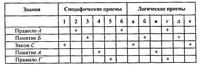 В левой части таблицы по вертикали располагаются основные знания, составляющие контролируемый раздел. В правой части таблицы по горизонтали арабскими цифрами обозначены познавательные действия, характерные для данного предмета (грамматические, математические, природоведческие и т.д.), в которых (согласно целям обучения) контролируемые знания должны использоваться учащимися. Аналогично буквами обозначены логические приемы, подлежащие контролю в данном разделе предмета. Знаком «+» обозначено, в какой конкретной деятельности будет контролироваться то или иное знание. В соответствии с заполненной таблицей и составляются контрольные задания.