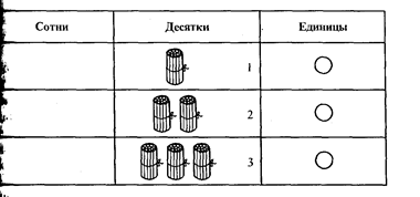 ' Подробнее см.: Салмина Н. Г., Колмогорова Л. С. Усвоение начальных математических понятий при разных видах материализации объектов и орудий действия//Вопросы психологии -1980 -№1 При усвоении новых действий детьми первых классов начальной школы материализация действия должна быть по возможности полной, т.е. охватывающей не только объект, с которым ребенок действует, но и другие элементы действия. Недостаточность материализации часто приводит к снижению успешности работы учащихся, к трудностям усвоения. Так, в вышеназванном исследовании Н.Г. Салминой и Л.С. Колмогоровой сравнивалась успешность усвоения позиционного принципа системы счисления при разной полноте материализации. В одной группе кроме приведенных видов материализации учащиеся строили разрядную сетку и использовали ее при выполнении заданий. Разрядная сетка представлялась следующим образом:
