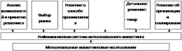 Итак, под международным маркетингом можно понимать следующее: 1) Реализация товаров или услуг за пределами своей страны. 2) Проведение фирмой маркетинговых мероприятий при условии, что фирма - часть другого предприятия (производитель или продавец на зарубежном рынке) и (или) имеется некоторое влияние или контроль за маркетинговой деятельностью компании, который исходит из другой страны. Концептуально основа международного маркетинга выражается в следующем: - интернационализация предприятий и хозяйственной жизни в целом; - бурное развитие НТП, структурная перестройка производства; - перемены в характере товаров, поставляемых на рынки (интерес к “ноу-хау”, обмену лицензиями, интернационализация НИОКР и т.п.); - сокращение ЖЦТ при одновременном росте требовательности потребителей к упаковке, качеству, дизайну и другим параметрам товара, импортируемого в страну; - обострение конкурентной борьбы (в ряде случаев - ценовая, торговая война). Второй аспект международного маркетинга - это необходимость разработки стратегии и тактики маркетинга, а также приспособления комплекса маркетинга в целом к условиям конкретного странового рынка, например американские, западногерманские или индонезийские версии комплекса маркетинга. Помимо прочего, международный маркетинг - это особая интегративная функция управления, в рамках которой осуществляются планирование, организация, финансирование и контроль международной маркетинговой деятельности. Учитывая вышеизложенное, можно определить международный маркетинг с точки зрения его экономической сущности: 1) это рыночная концепция управления, построенная на принципах оптимизации производственно-хозяйственной деятельности, в основе которой лежат существующие и будущие потребности зарубежных рынков при одновременном достижении эффективности работы компании; 2) это логика предпринимательского мышления, согласно которой весь рынок (мировой) рассматривается как источник получения прибыли на систематизированной (плановой) основе. Базой принятия всех решений в международном маркетинге служат маркетинговые исследования различной направленности и характера и лежащая в их основе информационная база. Основные маркетинговые решения представлены на рис.1.1.