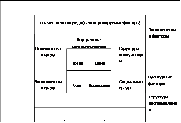2.2. Интернационализация производства В качестве причин, побуждающих предприятия к интернационализации, можно выделить следующие: 1) улучшение загрузки имеющихся и дополнительно вводимых мощностей; 2) повышение эффективности сбытовой деятельности путем усиления рыночных позиций (например на основе создания филиалов, дочерних предприятий), расширение сети сервисных пунктов и т.п.; 3) обеспечение долгосрочного успешного сбыта, т.е. экономического роста фирмы, повышение ее конкурентоспособности; 4) снижение общего риска за счет выпуска большего объема продукции (в натуральном выражении), в том числе в зарубежных филиалах компании; 5) стабилизация ценовой политики или расширение рамок для ее осуществления на внутреннем и зарубежном рынках и т.д. Процесс выхода на внешний рынок - это постепенный процесс, включающий в себя ряд стадий: 1) местная стадия, или производство; 2) начальная стадия интернационализации (наличие контрактов за рубежом без привлечения контрагентов); 3) наличие разнообразных контрактов, но без создания производительных предприятий за рубежом; 4) наличие предприятий-филиалов, дочерних компаний, которые расположены не более чем в 6 странах; 5) многонациональная интернационализация (создание предприятий более чем в 6 странах, образование транснациональных корпораций). Результат интернационализации - это реализация промышленного цикла в рамках нескольких государств. Предприятия связаны не только финансово-экономически, но и технологически: они - часть международного производственного комплекса с единым технологическим и коммерческим планом. В результате интернационализации возникают монополии нового типа - межнациональные, транснациональные компании (ТНК). Например, “Юнилевер”, “Электролюкс” и т.д. ТНК - это компания, включающая единицы в двух или более странах независимо от их юридической формы и поля деятельности. ТНК, как правило, мощные компании, имеющие не только производственный, но и политический вес. Сейчас ТНК (крупнейшие из них) приобретают глобальный характер: создание филиалов в различных уголках земного шара, активный процесс международного разделения труда, трансформация связей между странами. Однако, несмотря на форму выхода на внешний рынок, стиль поведения на нем, компания должна учитывать весь комплекс контролируемых и неконтролируемых факторов, действующих на рынке, с целью установления соответствия товар-страна и выбора приемлемого комплекса маркетинга. Речь об этом пойдем в следующих разделах. 2.3. Среда международного маркетинга: ее составляющие и изучение Изучение среды международного маркетинга - одно из первых главных комплексных решений, принимаемых в сфере международного маркетинга. Международный рынок динамичен. На него оказывает влияние ряд факторов глобального характера, среди них: интернационализация производства в рамках мировой экономики, становление европейской валютной системы и введение единой денежной единицы Евро, локальные конфликты, рост экономической мощи азиатских стран на мировом рынке (Япония и т.д.). Среду международного маркетинга формируют влияющие на него факторы (рис.1.2).