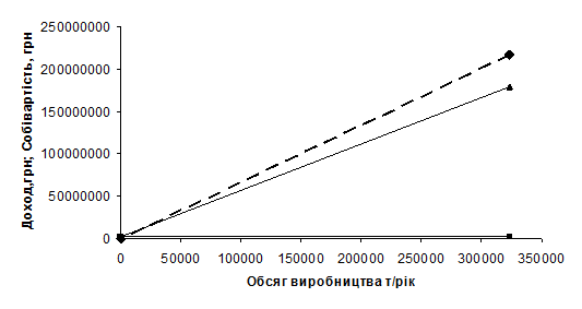 Витрати за статтею 1 „Матеріали і сировина” та статті 2 "Паливо і енергія" розрахуємо на основі планово-заготівельних цін та прогресивних витратних норм на одиницю базового підприємства по даним [1]. Витрати за статтею 3 "Основна заробітна платня основних виробничих робітників" та статті 4 "Додаткова заробітна платня основних виробничих робітників" приймаємо з урахуванням розроблених розрахунків фонду заробітної платні (табл.4.1). Затрати по статті 5 "Відчислення" складає 38,86% від загально річного фонду зарплатні основних виробничих робітників. Затрати по статті 6 "Витрати на утримання та експлуатацію обладнання" складає: а) амортизація робочих машин, основного технологічного обладнання, та інші фонди (табл. .3.1): 30389,4+183168,6+183893+141366+55785+55331,5+37411=874126,50 грн. б) поточний ремонт обладнання. Затрати приймаємо у розмірі 6% від балансової вартості перерахованого вище обладнання (табл. .3.1): 2834741,84·0,06=170084,51 грн. в) утримання обладнання. Затрати складають із зарплатні ремонтної та чергової групі та відчислювань від зарплатні: 1519440,56 грн. Разом по статті 6: 874126,50 +170084,51+1519440,56 =2563651,57 грн Сума статей 1-6 складає величину основних витрат: 155375510,43+14033389,86+1729059,1+172905,91+2563651,57=173874516,9 грн. Затрати по статті 7 "Цехові витрати" складають із слідуючих витрат: а) утримування цехового персоналу включає загально річну зарплатню ІТР, службовців, спеціалістів, допоміжних робітників та відчислення на зарплатню (38,86% суми заробітних плат перелічених категорій). 550225,6·1,3886=764043,3 грн. б) затрати на амортизацію будівель, споруд (табл.3.1): 561293+1169089=1730382 грн. в) затрати на поточний ремонт та утримання будівель цеху приймаємо в розмірі 2% від балансової вартості будівель: (7016159,17+14613608,4) ·0,02=432595,35 грн. Разом за статтею: 2927020,65 Сума статей 1-7 складає цехову собівартість: 176801537,6 грн. Стаття 8. Загальнозаводські витрати дорівнюють 5% від різниці цехової собівартості та статей "сировина та матеріали": (176756113,30-155375510,43) ·0,05=1069030,144 грн. Виробнича собівартість дорівнює: 176801537,6+1069030,144=177870567,7 Затрати по статті 9 "Позавиробничі витрати" приймаємо у розмірі 1,0% від виробничою собівартості: 1778705,677 грн. Сума виробничої собівартості та поза виробничих витрат складає повну собівартість: 179649273,4 грн (на одиницю 555,5). Визначимо крапку беззбитковості: