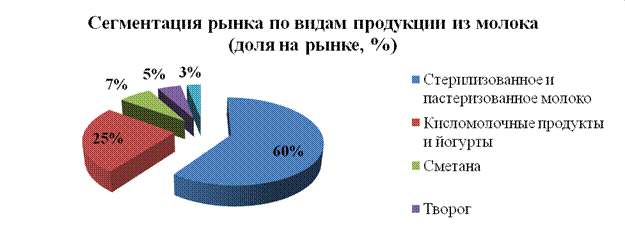 Источник: Федеральная Служба Государственной Статистики В сегменте цельномолочной продукции, увеличение наблюдается в натуральном выражении на 8% в год, наибольшую долю занимает стерилизованное и пастеризованное молоко, оно занимает долю 60% от всего рынка молочной продукции. Затем идут кисломолочные продукты, включая йогурты, этот сегмент рынка составляет более 25%, сметана 7%, творог 5%. Диаграмма 4 Источник: Федеральная Служба Государственной Статистики В сегменте цельномолочной продукции наиболее динамично развивается потребление кисломолочных продуктов, которое ежегодно увеличивается на 9%, в результате данный сегмент рынка в объеме цельномолочных продуктов показывает стабильный показатель роста. В сегменте кисломолочных продуктов лидерами являются йогурты, потребление которых растет ежегодно в среднем на 30-40%. Рынок молочных продуктов можно разделить также на следующие сегменты: - Традиционная продукция (молоко стерилизованное, пастеризованное; сметана; сливки стерилизованные, пастеризованные; сливочное масло; творог; кефир; кисломолочные продуты (ряженка, простокваша, варенец). - Продукция сегментов «вкус», «польза» «польза-вкус» (йогурты; обогащенная биопродукция (биокефиры, биойогурты и т.п.); десерты; творог зерненный). Диаграмма 5