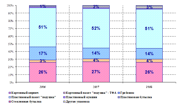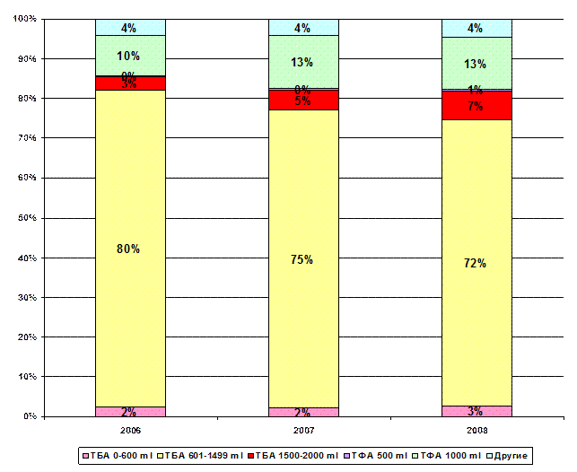 Источник: оценка ТР Другой заметной тенденцией становится диверсификация продукции: появляются продукты в новых форматах и объемах упаковки. Кроме того, растет доля молочных продуктов в пол-литровой упаковке. Урбанистический стиль жизни предполагает индивидуальное потребление. Кроме того, с каждым годом уменьшается количество членов среднестатистической городской семьи – все чаще это пары, одинокие люди или семьи с одним ребенком. Для них литровый пакет – объем избыточный, и именно поэтому спрос на упаковки меньшего объема постоянно растет и будет расти. Также увеличивается доля молочных продуктов в больших упаковках: 1,5 и 2 литра, в 2008 году рост составил 7%. Диаграмма 9 Доля продаж больших упаковок на рынке асептической упаковки