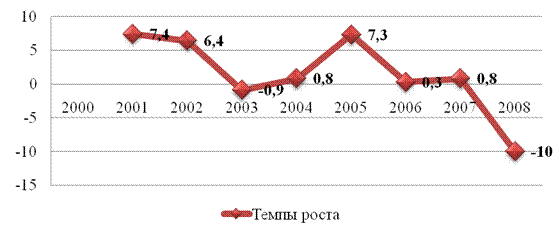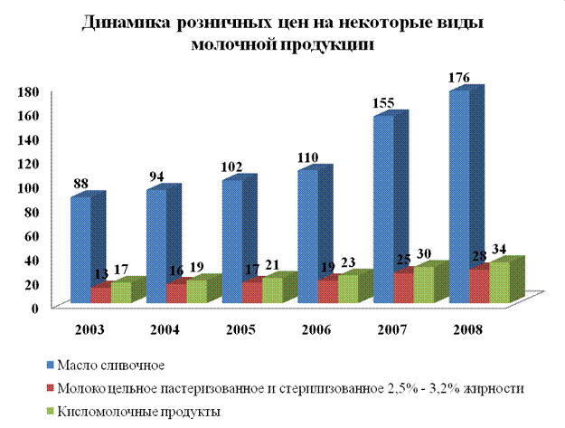 Источник: по данным ГВЦ Минсельхоза РФ и ГОСКОМСТАТА РФ В сельхозпредприятиях прирост производства молока составил 0,6%. Прирост обеспечен за счет устойчивого роста молочной продуктивности коров. Средний надой молока на одну корову в с/х организациях вырос на 7,1%, или на 266 кг, и составил 4024 кг. В 2008 году поголовье КРС в хозяйствах всех категорий к предыдущему году снизилось на 1,9% и составило 21,1 млн.голов, в том числе коров – на 1,3% (9,2 млн. голов). В крестьянских (фермерских) хозяйствах возросло производство молока – на 5,7%. В рамках Госпрограммы поставлена задача увеличить производство молока к 2012 году почти на 18% и довести его объемы до 37 млн. тонн. По итогам 2008 года импорт молочной продукции превысил 7 миллионов тонн. Таким образом, в целом самообеспеченность внутреннего рынка молочной продукции составляет 78 %, что является неплохим показателем по сравнению с некоторыми другими продовольственными рынками. По данным компании «Молочный альянс» в Россию импортируется 15% всех молочных продуктов. Важными статьями импорта являются сгущенное молоко и сливки (3%), натуральное молоко (3,8%) и сливочное масло (39%). Из Новой Зеландии (40%), Финляндии (17%) и Украины (11%) ввозится значительное количество сливочного масла, поэтому немногие российские предприятия специализируются сегодня на его производстве. Импорт сыров также способствует общему развитию рынка. Однако по сравнению с другими рынками потребление сыров в России весьма ограничено и составляет около 2–3 кг на человека в год. По разным оценкам объем этого рынка составляет приблизительно 800 млн. долларов, притом что большая часть сыров объемом около 50 тыс. тонн ввозится из-за рубежа. Сыры местного производства занимают минимальную долю на рынке и по качеству, как правило, значительно уступают зарубежным. 2.2 Объем и емкость Рынка В настоящее время емкость рынка молока составляет около 7,5 млн. тонн и оценивается по различным источникам от 4,5 до 6 млрд. долларов США в год. Объем рынка пакетированных молочных продуктов в России составлял 9,3 миллиардов литров в 2006 году и 9,5 миллиардов литров в 2007. В 2008 году емкость рынка сократилась за счет беспрецедентного роста цен на сырое молоко в 2007 году. Емкость сегмента молока в натуральном выражении составляет около 55-60 млрд. литров. В краткосрочной перспективе производители на рынке молока не предвидят увеличения объема рынка и скорее прогнозируют возможный незначительный спад из-за кризиса возможных сокращений доходов частных граждан. В тоже время, принимая во внимание низкий уровень потребления молока и молочных продуктов в целом по России и отдельно в крупных городах: Петербурге, Москве, Уфе, Новосибирске, Волгограде, Самаре, Ростове и Нижнем Новгороде, эксперты рассматривают сложившуюся ситуацию на рынке как долгосрочную возможность для увеличения емкости рынка и объема потребления молока и молочных продуктов. В частности, домохозяйства стабильно показывают неплохой спрос на йогурты, обогащенные молочные продукты и молочные десерты. Специалисты также ожидают дальнейшее увеличение потребления продуктов с долгим сроком хранения, включая стерилизованное молоко. 2.3 Темпы роста Рынка В настоящий момент исследуемый Рынок является не самым быстрорастущим продуктовым сегментом. В большей степени темпы роста всего молочного рынка замедлились за сч
