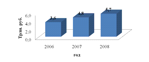 Источник: «Маркет Аналитика» У перерабатывающих предприятий молочной отрасли традиционно существует три канала сбыта: · через дистрибьюторов, как правило, постоянных; · самостоятельная доставка продукции в точки продажи; · поддержка складов, с которых розничные продавцы могут забрать товар. Использование каналов сбыта зависит от типа производителя. Лидеры национального рынка используют все каналы сбыта. Во-первых, они имеют своих постоянных дистрибьюторов во многих регионах. Дистрибьюторы обеспечивают доведение продукции до магазинов и других точек продаж, могут давать консультации по ассортименту фирмы и рекомендации по выкладке товаров на прилавке. Однако дистрибьюторы крупных фирм часто предпочитают работать с супермаркетами и универсальными магазинами, не уделяя достаточно внимания более мелким торговым точкам, что особенно характерно для региональных рынков, так как продукция национальных компаний дороже и ее аудитория – это посетители супермаркетов и больших гастрономов. Решить эту проблему позволяют склады молочной продукции, с которых заинтересованные лица могут самостоятельно вывезти нужный товар. Однако если в крупных магазинах ассортимент достигает 30-40 наименований, то на рынках 10- 15. Также лидеры рынка работают и с отдельными оптовыми покупателями. 5.2 Описание розничного сегмента По оценкам аналитических компании оборот продуктового ритейла по итогам 2008 года составил 5,7 трлн. руб. Темпы роста в 2008 году составили 15,7 %, что на восемь процентных пунктов меньше, чем в 2007 году. Диаграмма 17 Динамика продуктового ритейла за период 2006-2008 гг., трлн. руб.