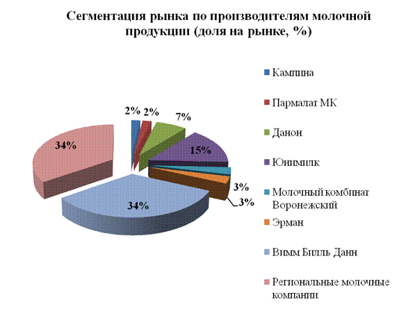 Источник: рейтинговое агентство «Топ Экспресс» Крупные производители молочных продуктов сосредоточены, главным образом, в Центральном и Приволжском федеральных округах. На их долю приходится порядка 54% всей производимой молочной продукции. Как показывает практика последних лет, региональные компании уходят «под крыло» крупных молокопроизводителей. Правда, многие мелкие игроки займут свои ниши: их основная функция будет заключаться в сборе сырого молока, в том числе и у населения. 7.2 Описание профилей крупнейших игроков Рынка 1. «Вимм Билль Данн» Самой крупной на рынке молока является группа «Вимм Билль Данн», по некоторым оценкам занимаемая компанией доля составляет 34%. С момента основания в 1992 году «Вимм Билль Данн» занимает ведущее положение на российском рынке продуктов питания и молока. Более 74% выручки компании составляют доходы от продажи молочных продуктов. У группы есть ряд преимуществ по сравнению с другими российскими производителями. К этим преимуществам относятся: имеющиеся большие недозагруженные производственные мощности, это дает потенциал для роста без дополнительных капиталовложений, более высокое качество выпускаемых продуктов, высокая степень инноваций, имеются возможности по разработке новых продуктов и профессиональный маркетинг. Другими важными конкурентными преимуществами «Вимм Билль Данн», которые позволят ей, по мнению специалистов, удерживать ведущие позиции на российском рынке молока, молочных продуктов и соков, являются: сильные и диверсифицированные товарные бренды («Домик в деревне», «Нео», «33 коровы», «Чудо», «Весѐлый молочник», Bio-Max, Imunele, «Ламбер»), стабильный доступ к источникам сырья, акцент на разработку новых продуктов, современная производственная база и технологии, также у компании существуют возможности по привлечению внешнего финансирования. Компания «Вимм-Билль-Данн» создала единую производственную сеть в регионах России и странах СНГ, став общенациональным российским производителем. Сейчас в группу компаний «Вимм-Билль-Данн» входит 37 производственных предприятий в России, на Украине и в Центральной Азии. Стратегия «Вимм-Билль-Данн» – производить молочные продукты в том регионе, где они потребляются. Программа развития компании предполагает увеличение числа именно региональных предприятий 2. «Данон» Эксперты считают, что одним из основных конкурентов на рынке молока является французская «Данон». Самая активная из зарубежных производителей молока, компания проводит агрессивную рекламную политику. Основные направления деятельности компании — молочные продукты, детское питание и минеральная вода. Ассортимент компании насчитывает более 200 наименований продуктов питания. На данный момент большая часть продукции, продаваемой в России - а это около 150 000 тонн кисломолочной продукции в год - производится на российских предприятиях. «Данон» владеет молочным комбинатом в Поволжье, где делается натуральный йогурт, йогурт с фруктовыми добавками и кефир, кроме этого компания имеет молочный комбинат в Московской области. Такие торговые марки как «Данон Йогурт», «Активиа», «Даниссимо», «Растишка», «Утренний», кефир «Классический» завоевали доверие и любовь российского потребителя. По проведенным маркетинговым исследованиям в городах России в 2008 году доля компани