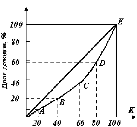 Источник Официальный сайт Госкомстата РФ, www.gks.ru Приложение 2 Кривая Лоренца ( на примере распределения доходов в России в 2000г.)