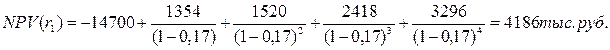 где r 1 – значение табулированного коэффициента дисконтирования, при котором NPV ( r 1 )>0 ; r 2 – значение табулированного коэффициента дисконтирования, при котором NPV ( r 2 )<0 . r1 =17% r2 =10%