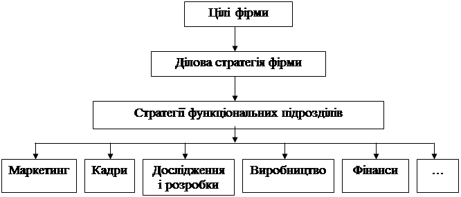 Рис. 1.1 Місце стратегічного маркетингу у процесі стратегічного управління фірмою Отже, розглядаючи стратегічний маркетинг як складову стратегічного менеджменту, ми виходимо з поняття «функціональна стратегія». Адже саме така стратегія визначає напрям діяльності тієї чи іншої функціональної служби в межах ділової стратегії фірми. Приділяючи належну увагу функціональній стратегії, фірма має змогу результативно впливати на розмір внеску того чи іншого функціонального підрозділу в ділову стратегію фірми і на обсяг витрат для фінансування цього підрозділу. Оскільки служба маркетингу є складовою організаційної структури фірми, остільки стратегічний маркетинг – важлива невіддільна частина стратегічного менеджменту фірми. Основними категоріями стратегічного маркетингу є: місія фірми, стратегічний господарський підрозділ, маркетингова ціль, портфель бізнесу фірми, маркетингова стратегія, ринкова частка фірми, відносна ринкова частка фірми. Місія фірми (або корпоративна місія) узагальнює головне призначення функціонування фірми, за допомогою якого вона реалізує мету свого існування (одержання прибутку). Місія фірми відтворює ті різновиди бізнесу, на які орієнтується фірма з урахуванням ринкових потреб, колі споживачів, особливостей продукції та наявності конкурентних переваг. Місію фірми визначають такі основні фактори: - коло потреб, яке задовольняє фірма; - коло споживачів фірми; - товари, які виробляє фірма; - конкурентні переваги фірми. Категорія «стратегічний господарський підрозділ» (СГП) - це відокремлена зона бізнесу фірми, яка відповідає за певний вид її ринкової діяльності. СГП може охоплювати важливий підрозділ фірми, кілька товарних груп або навіть один товар чи товарну марку, яку виробляє фірма. Стратегічний господарський підрозділ характеризується такими параметрами: - певний вид продукції, який включає товарі або послуги; - специфічні потреби, які мають бути задоволені; - певна група споживачів; - конкурентні переваги фірми. Порівнюючи складові елементи СГП та місії фірми, можна помітити їхню схожість. Різниця між цими двома категоріями полягає в тому, що СГП – це первинна зона стратегічного планування фірми, а місія – узагальнююча, об’єднувальна на рівні фірми категорія, яка передбачає визначення певних пріоритетів серед СГП. Основні риси стратегічного господарського підрозділу такі: 1) СГП охоплює певний вид бізнесу (або кілька взаємопов’язаних видів бізнесу), який відокремлений від інших у межах фірми; 2) СГП має своє коло конкурентів, яких він намагається наздогнати і перевершити; 3) кожним СГП керує окремий менеджер, який відповідає за його стратегічний розвиток. Сукупність усіх стратегічних господарських підрозділів у межах фірми становить портфель бізнесу фірми. Завдання стратегічного маркетингу щодо управління портфелем бізнесу фірми такі: - зміцнювати становище стійких прибуткових СГП; - розвивати, інвестувати перспективні СГП; - виключати з діяльності неприбуткові, безперспективні СГП; - формувати нові СГП. Маркетингова ціль встановлюється після формування місії фірми та визначення впливу маркетингового середовища. Вона визначає основну мету маркетингової діяльності. Маркетингові цілі мають відповідати таким вимогам: - ієрархічність (підпорядкованість) – передбачає, що місії фірм