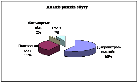 Рис. 2.1 Аналіз ринків збуту ЗАТ «ОРРЗ» за 2006 рік З таблиці 2.6 видно, що найбільшу частку ринку займає Дніпропетровський регіон – 14146,9 тис. грн., тому що саме в цьому регіоні знаходяться крупні підприємства гірничо-збагачувального комплексу. Другим великим регіоном є Полтавський – 8045,1 тис. грн., бо в ньому є найбільший гірничо-збагачувальний комбінат, де частіше виконуються ремонти кар’єрної техніки, і, відповідно, замовлення на виготовлення запасних частин у ЗАТ «ОРРЗ». Третім регіоном є Росія, об’єм продажу запасних частин складає – 1713,9 тис. грн. У відсотковому відношенні частка ринку складає 7 %. Така невелика частка експортних операцій по збуту продукції заводу пояснюється тим, що на ринку російських запасних частин існують конкуренти-гіганти, такі як «ОМЗ» (Об’єднані машинобудівні заводи), і підприємству важко конкурувати із зазначеними підприємствами. Найменшим регіоном по реалізації продукції є Житомирський. Об’єм реалізації складає 402,5 тис. грн, тому що в даному регіоні зосереджені невеликі підприємства по видобутку щебеню і потреби в запасних частинах менші, ніж в інших регіонах України. ЗАТ “ОРРЗ в своїй збутовій діяльності застосовує прямий канал розподілу. Для задоволення потреб споживачів організований збутовий підрозділ, який підпорядковується службі маркетингу підприємства [14,21]. За такої ситуації ЗАТ “ОРРЗ” контролює розподіл своєї продукції від складу до виробничого майданчику кінцевого споживача. Цей контроль безпосередньо здійснюється службою маркетингу підприємства. Для стимулювання збуту товарів використовується метод формування іміджу серед промислових підприємств гірничо-збагачувального та металургійного комплексу. Служба маркетингу поширює інформацію про підприємство, його основні види діяльності, застосовує відгуки споживачів про завод та товари, які він випускає. Велика увага приділяється діловому листуванню, як методу стимулюванню збуту. Рівень ведення ділового листування впливає на обсяг збуту через обробку замовлень від існуючих та потенційних покупців, кожен діловий лист складається менеджерами служби маркетингу з поданням технічної та комерційної інформації про товар. Ділові листи, які підтверджують одержання замовлення, надають можливість для стимулювання збуту, особливо при встановленні відносин з новими клієнтами, які не виявляли активності та при одержанні великих замовлень. Порівняно невеликі витрати, пов’язані з поліпшенням ділового листування ЗАТ “ОРРЗ”, дають значний ефект, підсилюють його конкурентоспроможність, сприяють встановленню нових зв’язків та зміцненню відносин з традиційними споживачами. Обравши прямий канал збуту своєї продукції, ЗАТ “ОРРЗ” застосовує стратегію проштовхування, яка передбачає використання менеджерів і стимулювання збуту для нав’язування товару споживачам. Всі стратегічні рішення, які приймає ЗАТ “ОРРЗ” по комплексу маркетингу, а також процесу управління маркетингу, є наслідком впливу зовнішнього маркетингового середовища та кон’юнктури. Кон’юнктуру ринку треба вивчати та прогнозувати. В іншому випадку не продаш та не купиш по найбільш вигідним цінам, не справишся з маневруванням ресурсів та зміненням випуску товару. Продуктом цих умов маркетингу є прогноз ситуацій на ринку, різний по строкам та ступеню достовірно
