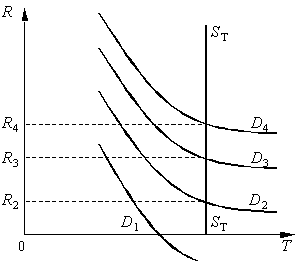 Из этой формулы видно, что цена земли будет расти если увеличивается размер ренты и падать, если повышается норма процента. На практике цена земли зависит от множества факторов, среди которых можно выделить растущий спрос на нее для несельскохозяйственных целей, инфляцию и т. д. До сих пор мы исходили из предположения, что у каждого участка земли одинаковое качество. Но это не так. Размер ренты зависит от качества земельного участка. Это означает, что производительность земли как фактора производства будет различной в зависимости от ее плодородия, а также местоположения (близость к рынку сбыта сельскохозяйственной продукции). Образование дифференциальной земельной ренты, обусловленной качественной неоднородностью земли, можно легко проследить на уже представленном ранее графике, но немного с другой точки зрения. Предположим, что производится только один сельскохозяйственный продукт, скажем, зерно на четырех участках земли разного качества, причем размер каждого участка фиксирован и равен OS . При сочетании с равными величинами капитала, труда и других взаимосвязанных ресурсов производительность или, более точно, предельная производительность в денежном выражении каждого участка земли отражена кривыми спроса D 1 , D 2 , D 3 , D 4 . Участок земли № 1 – наименее производителен, а участок № 4 – наиболее производителен. Из–за ограниченности и фиксированности земельных участков кривая их предложения SТ SТ (а за одно и предельных издержек – SТ SТ = MRC ) имеет вертикальный вид. Соответствующая экономическая рента с участков № 1, № 2, № 3 будет в точках пересечения спроса и предложения, в которых предельная производительность равна предельным издержкам. При этом разница в ренте отражает качественную неоднородность трех участков земли. Качество земли на участке № 1 настолько низкое, что для фермера было бы невыгодно вводить его полностью в оборот. Итак, дифференциальная рента – это доход, полученный в результате использования ресурсов (с неэластичным предложением) более высокой производительности в ситуации ранжирования этих ресурсов по плодородию и местоположению. Дифференциальная рента образуется не только в сельском хозяйстве, но и в добывающей промышленности и строительстве. В добывающей промышленности она, как и в землевладении, порождается различиями в уровне производительности труда и величине стоимости продукта. Эти различия обусловлены неодинаковым богатством залежей полезных ископаемых, неравенством других природных условий для шахт, рудников, нефтяных скважин и др. Поскольку цены на продукты добывающей промышленности устанавливаются по худшим условиям ее производства, то на лучших участках земли, где полезные ископаемые добываются с меньшими издержками, образуется разностный доход, который присваивается собственником земли в форме дифференциальной ренты. Земельные собственники получают дифференциальную ренту также за участки земли, на которых строятся здания и сооружения. Ее величина во многом зависит от местоположения сооружаемого объекта. При рассмотрении дифференциальной ренты выяснилось, что на худших землях она не образуется. Однако землевладелец и эти земли сдает в аренду, т. к. получает за это абсолютную ренту. Причиной ее образования является монополия частной собственности на землю.