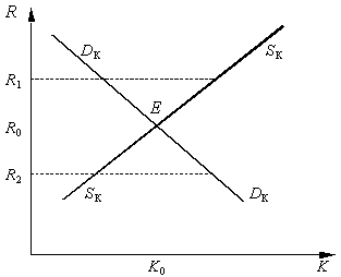 Например, доход на капитал в 10 % означает, что вложение дополнительного рубля сегодня увеличит грядущий доход на 10 к., т. е. даст суммарной продукции на 1 р. и 10 к. В свете сказанного ясно, что капиталообразование может быть тогда, когда прирост продукции в будущем станет больше, чем ее сокращение в настоящем. Иначе говоря, рубль сегодня стоит больше рубля завтра. Экономическая теория подчеркивает, что сегодняшние блага люди оценивают выше будущих благ. Это особенность экономического поведения субъектов рыночного хозяйства получила название временного предпочтения. Для того чтобы побудить владельца капитала отказаться от сегодняшнего распоряжения ресурсами, необходимо вознаградить его за такой отказ. Люди готовы забыть о временном предпочтении, если знают, что завтра, например, вместо одного рубля получат 1 р. и 10 к. Это значит, что норма временного предпочтения составляет 10 к. Те же хозяйственные агенты, которые получают заемные средства, должны заплатить за это владельцу капитала. При анализе нормы временного предпочтения нужно учитывать, что если уровень доходности на капитал – объективная величина, то норма временного предпочтения – субъективная величина и у всех людей разная. Равновесие на рынке капитала возникает, если норма временного предпочтения уравнивается с уровнем дохода на капитал. Здесь возможны три ситуации: · Норма временного предпочтения равна уровню доходности капитала. В этой ситуации процесс образования капитала идет нормально. · Норма временного предпочтения больше уровня доходности капитала. В этой ситуации нет образования капитала, средства проедаются. · Норма временного предпочтения меньше уровня доходности. Капитал в этом случае резко активизируется, идет процесс образования капитала. Все приведенные соображения о капитале важны, поскольку дают возможность понять ситуацию на рынке капиталов, уяснить основу процентного дохода. Процентный доход возникает в процессе совершения кредитных сделок, самая существенная черта которых есть сделка между настоящим и будущим. Это можно выразить фразой: «Я отказываюсь от благ сейчас, но должен получить больше в будущем». Все хозяйственные агенты оперируют на рынках, которые экономисты называют рынками ссудного капитала. Графически ситуацию на этих рынках можно представить на рис. 13.2. На этом рисунке R – это уровень процента, а К – объем инвестиционных средств (ссудный капитал).