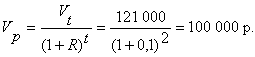 Какие еще факторы влияют на уровень процентной ставки? Важнейшими из них являются: 1. условия займа; 2. форма предоставления займа (наличные или безналичные деньги, бумажные деньги или золотом); 3. размеры риска; 4. инфляционные ожидания; 5. характер налоговой политики, законов, регулирующих рыночные отношения. Рыночная ставка процента играет важную роль при принятии инвестиционных решений. Инвестиции нельзя считать рентабельными или нерентабельными, если не принимать во внимание ставку процента. Высокая процентная ставка позволяет отобрать самые безотлагательные и самые экономичные проекты. По мере того, как инвестиционное накопление в предшествующий период вызывает к жизни действие закона убывающей доходности, процентные ставки станут снижаться. Это послужит сигналом для осуществления тех проектов капитальных вложений, которые характеризуются более низкой производительностью. Рыночная процентная ставка в этом процессе служит минимальной нормой прибыльности. Если какой-то вариант капитальных вложений имеет производительность, равную процентной ставке, то это последний вариант, который еще может интересовать предпринимателя. Таким образом, инвестиции следует осуществлять, если ожидаемый уровень дохода на капитал не ниже или равен рыночной ставке процента по ссудам. Сам же процент выполняет важнейшую задачу эффективного распределения ресурсов, выбор наиболее доходного из возможных инвестиционных проектов. Принятие любого инвестиционного решения включает в себя сравнение издержек и ожидаемой прибыли, рассматриваемые в течение определенного временного интервала. Другими словами, основой является сравнение стоимости единицы капитала в настоящий момент с будущей прибылью, обеспеченной этой единицей вложений. По сути это проблема сопоставления величины капитала в различные периоды времени, которая получила название дисконтирование. Дисконтирование основано на том, что любая сумма, которая будет получена в будущем, в настоящее время обладает меньшей полезностью (ценностью), поскольку если пустить сегодня эту сумму в оборот и заставить приносить доход, то через год, два, три она не только сохранится, но и приумножится. Дисконтирование позволяет определить нынешний денежный эквивалент суммы, которая будет получена в будущем. Для этого ожидаемую к получению в будущем сумму нужно уменьшить на доход, нарастающий за определенный срок, по правилу сложных процентов. Если мы сегодня инвестируем 100 000 р. под 10 % годовых, то через год мы получим 110 000 р. Эту сумму мы получили следующим образом: 100 000 р. · (100 % + 10 %) или 100 000 · (1 + 0,1) = 110 000 р. Через два года: 100 000 · (1 + 0,1) · (1+0,1) = 121 000 р. и т. д. Этот процесс реинвестирования вместе с доходом на него для получения еще большего дохода в следующих периодах называется «сложением процентов» и описывается следующей формулой: Vt = Vp · (1 + R )t , где Vt – будущая сумма денежных средств; Vp – начальная стоимость; R – ставка процента или норма доходности, деленная на 100; t – число периодов времени, в каждом из которых накопленные проценты присоединяются к общей сумме. Зная будущую денежную сумму и ставку процента (в нашем примере 10 %), можно определить современную стоимость этой денежной единицы по формуле вытекающей из предыдущей: