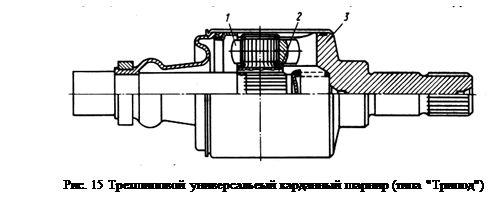 сколько компенсирует упрощение протяжки канавок корпуса. К точности расположения канавок предъявляются высокие требования. Шарнир имеет высокий КПД и применяется на переднеприводных автомобилях. Трехшиповой карданный шарнир (типа "Трипод"). Такие карданные шарниры устанавливают на легковых и грузовых автом-обилях малой грузоподъемности. Конструктивно эти шарниры имеют два исполнения: шарниры, позволяющие передавать момент при углах между валами до 43°, но не допускающие осевых перемещений (шарниры жесткие), и универсальные шарниры, допускающие осевую компенсацию, но работающие при сравнительно небольших углах между валами. В жестком шарнире (рис 14) шипы 2, расположенные под углом 120°, закреплены в корпусе 1. Ролики 3 с шаровой поверхностью установлены на шипах и могут свободно на них поворачиваться. Вилка 4, выполненная вместе с валом 5, имеет три паза цилиндрического сечения. Поверхность вилки сферическая, что обеспечивает получение большого угла между валами. Принцип работы жесткого и универсального шарниров одинаков. Универсальный трехшиповой шарнир (рис.15) состоит из цилиндрического корпуса 3, выполненного за одно целое с валом, в котором имеются три продольных паза, ступицы 2 с тремя шипами, закрепленной на внутреннем конце карданного вала, трех роликов 1 на игольчатых подшипниках. Шипы, как и пазы, расположены под углом 120° одни относительно другого. Ролики имеют сферическую поверхность такого же радиуса, как цилиндрическое сечение продольных пазов. При вращении валов под углом ролики перекатываются в пазах, поворачиваясь на игольчатых подшипниках, и в то же время шипы могут перемещаться вдоль роликов подшипников, что обеспечивается кинематикой шарнира. Удлинение осуществляется за счет скольжения шипа вдоль подшипников. Универсальный шарнир этого типа может использоваться, если максимальное значение угла наклона валов не превышает 25°. Достоинством шарнира являются малые потери при осевом перемещении, так как это обеспечивается практически только качением, что определяет высокий КПД шарнира. Сдвоенный карданный шарнир. Рис 16. Он представляет собой два шарнира 1 неравных угловых скоростей, объединенных двойной вилкой 2. Равенство угловых скоростей должно обеспечиваться делительным рычажком. Однако, из-за особенностей конструкции синхронное вращение соединяемых валов может быть обеспечено только с некоторым приближением. Коэффициент неравномерности вращения зависит от улга между валами и от размеров делительного устройства. Для двойного шарнира на игольчатых подшипниках характерен значительный износ этих подшипников и шипов крестовин. Это объясняется тем, что благодаря преимущественно прямолинейному движению автомобиля иглы подшипников не перекатываются, вследствие чего поверхности деталей, с которыми они соприкасаются, подвержены бринеллированию, а сами иголки иногда сплющиваются. Кулачковый карданный шарнир. Рис.17. Кулачковые шарниры применяются на автомобилях большой грузоподъемности и приводе к ведущим колесам. Если разделить по оси симметрии кулачковый карданный шарнир на две части, то каждая часть будет представлять собой карданный шарнир неравных угловых скоростей с фиксированными осями качения (так же как у сдвоенного карданного шарнира). Благодаря наличию развитых поверхностей взаим