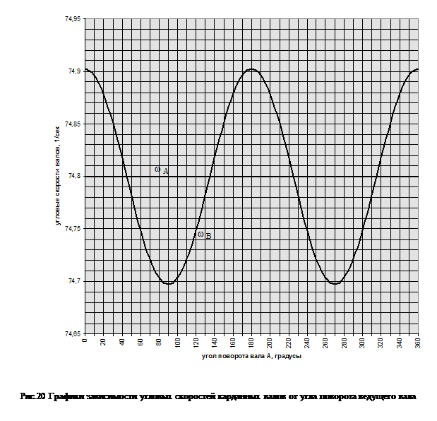 После алгебраических преобразований получаем зависимость угловой скорости ведомого вала В от угловой скорости ведущего вала А, угла поворота ведущего вала и угла перекоса валов: