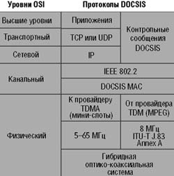 3.2 Стандарты модемов [7, 8] Двумя основными стандартами на кабельные модемы являются MCNS/ DOCSIS и DVB/DAVIC. Однако если первый, американский, стандарт пользуется безоговорочной поддержкой американских производителей и операторов, то второй, европейский, стандарт сталкивается с все более жесткой конкуренцией европейского аналога DOCSIS — так называемого EuroDOCSIS (основное различие между американской и европейской версией DOCSIS связано с разной шириной телевизионных каналов в США и Европе и затрагивает только физический уровень). Изначально эти стандарты были рассчитаны на поддержку разных приложений. Если Совет по цифровому аудио и видео (Digital Audio Visual Council, DAVIC) разрабатывал стандарт для предоставления интерактивных услуг на базе телевизионных приставок, то американские кабельные операторы (Multiservice Cable Operator, MCO), объединившиеся в MCNS, ориентировались, прежде всего, на предоставление в качестве дополнительной услуги передачи данных по кабелю. Отсюда и их основные отличия. Стандарт DVB/DAVIC опирается на использование фиксированных ячеек ATM и стандартных для ATM методов обеспечения качества услуг. Поддержка передачи данных, в частности TCP/IP, обеспечивается с помощью AAL5. Стандарт DOCSIS предусматривает использование стандартных кадров Ethernet и поэтому лучше всего подходит для передачи пакетных данных. При сравнении конкурирующие группы производителей часто прибегают к одному и тому же трюку, а именно — сопоставляют последнюю версию своего стандарта с предыдущей версией соперничающего с ним. Так, например, сторонники DVB/DAVIC напирают на поддержку качества обслуживания, хотя схожие возможности были включены в версию 1.1; а сторонники DOCSIS говорят об отсутствии в DVB/DAVIC защиты информации, хотя соответствующие средства были определены уже в DVB/DAVIC 1.4. Конечно же, объективные различия между стандартами существуют. Например, для обратного канала DVB/DAVIC предусматривает только модуляцию QPSK, тогда как DOCSIS — еще и 16-QAM. В результате первый поддерживает меньшую максимальную пропускную способность при доступе абонентов. Однако максимальная скорость в 10,24 Мбит/с в случае 16-QAM редко когда достижима на практике вследствие зашумленности каналов и конкуренции за доступ. Вообще, продолжать сравнение двух стандартов можно было бы довольно долго, но дело не в реальных достоинствах конкурентов, а в широте поддержки, которой они пользуются, так что, по-видимому, DVB/DAVIC уготована та же судьба, что и Token Ring, 100VGAnyLAN и ATM в локальных сетях. Впрочем, хотя и нельзя говорить непосредственно об объединении двух стандартов, разрабатываемый OpenCable стандарт для телевизионных приставок опирается на DOCSIS, но включает и компоненты DAVIC. Помимо двух названных есть и еще один, международный, стандарт IEEE 802.14. Однако из-за долгого отсутствия прогресса в разработке он не получил сколько-нибудь заметной поддержки, и сейчас соответствующая рабочая группа при участии компаний Broadcom и Terayon работает над физическим уровнем следующего поколения с высокой — до 30 Мбит/с — скоростью передачи данных в обратном направлении (от кабельного модема к станции). Иногда этот еще не появившийся стандарт неофициально называют DOCSIS 1.2. 3.3 Стек протоколов DOCSIS [14, 7] Ввиду доминирующего положения на рынке оборудования на базе DOCSIS мы кратко рассмотрим именно эту спецификацию (сокращение DOCSIS переводится как спецификация интерфе
