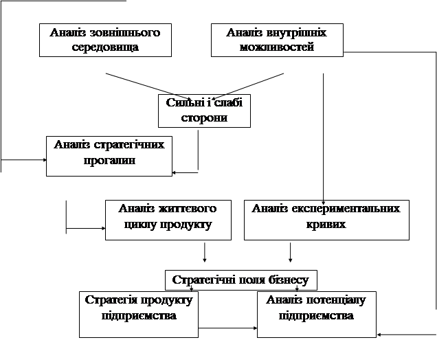 Рисунок 1.2 - Елементи маркетингової стратегії [45] Стратегія стабілізації використовується за умов швидкого або несподіванного падіння базових показників фірми чи за умов, коли розвиток фірми має коливний характер. Ця стратегія передбачає вирівнювання показників з їхнім наступним підвищенням і перехід до стратегії росту. Стратегія росту передбачає ріст обсягів продажу, прибутку, капіталу та інших показників фірми. Маркетингові стратегії росту поділяються на такі різновиди: - маркетингова стратегія інтенсивного (органічного) росту; - маркетингова стратегія інтеграційного росту; - маркетингова стратегія диверсифікації; 5. За елементами маркетингового комплексу: - товарна стратегія; - цінова стратегія; - стратегія товарного руху; - стратегія просування; 6. За ознакою конкурентних переваг(за М.Портером): - стратегія цінового лідерства; - стратегія диференціації; - стратегія фокусування(концентрації); 7. Залежно від виду диференціації: - стратегія товарної диференціації; - стратегія сервісної диференціації; - стратегія іміджевої диференціації; - стратегія кадрової диференціації. 8. Залежно від конкурентного становища фірми та її маркетингових спрямувань: - стратегія ринкового лідера; - стратегія челенджерів; - стратегія послідовників; - стратегія ринкової ніши. 9. Залежно від співвідношення відносної ринкової частки фірми та темпів росту її ринку збуту, або залежно від конкурентоспроможності та привабливості ринку збуту: - стратегія розвитку; - стратегія підтримання; - стратегія збирання урожаю; - стратегія елімінації; 10. Залежно від методу обрання цільового ринку: - стратегія товарної спеціалізації; - стратегія сегментної спеціалізації; - стратегія одно сегментної концентрації; - стратегія вибіркової спеціалізації; - стратегія повного охоплення. 11. Залежно від ступеня сегментації ринків збуту фірми: - стратегія недиференційованого (агрегованого) маркетингу; - стратегія диференційованого маркетингу; - стратегія концентрованого маркетингу. Стратегічне планування є однією з основних функцій стратегічного управління. Воно представляє собою процес прийняття управлінських рішень відносно стратегічного передбачення (формування стратегій), розподілу ресурсів, адаптації компанії до зовнішнього середовища, внутрішньої організації. Після формулювання місії на її основі встановлюються конкретні цілі, через які здійснюється місія підприємства. Цілі доводяться до виконавців, керівництво стимулює їх досягнення і тільки в цьому випадку вони становляться значимою частиною стратегічного планування. Наступний етап стратегічного планування - діагностичний, який включає аналіз навколишнього середовища та внутрішніх можливостей підприємства. Аналіз навколишнього середовища має на меті виявити потенційні загрози та можливості, з якими підприємство може зустрітись в майбутньому. Звичайно їх виділяють у сім областей: 1) економічні фактори; 2) політичні фактори; 3) ринкові фактори; 4) фактори технології; 5) фактори конкуренції; 6) міжнародні фактори; 7) соціокультурні фактори. Результатом такого аналізу може стати перелік майбутніх загроз та можливостей з урахуванням їх значення і ступеня впливу на підприємство. Після цього керівництво повинно проаналізувати внутрішній потенціал підприємства для того, щоб виявити його сильні і слабкі сторо