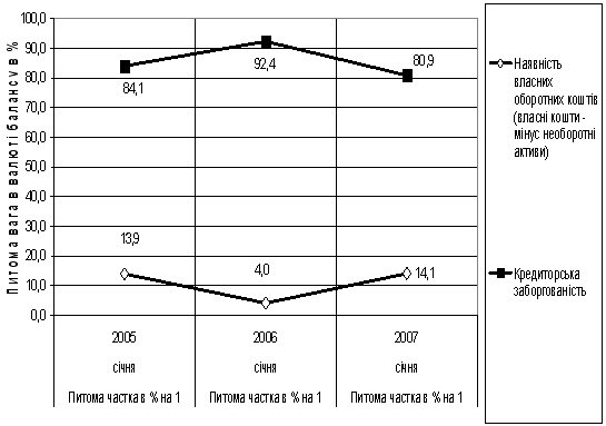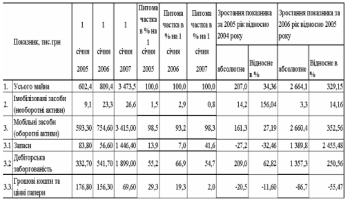 - динаміка структурної частки грошових коштів характеризується стрімким падінням з рівня 29,3% (2004) до 19, 3% (2005) та до 2,0% у 2006 році; - динаміка структурної частки запасів характеризується падінням з рівня 13,9 %(2004) до рівня 7,0%(2005) та стрімким нарощуванням до рівня 41,6% у 2006 році; - динаміка структурної долі дебіторської заборгованості характеризується підвищенням з рівня 55,2%(2004) до 66,9%(2005) та падінням до рівня 54,7% у 2006 році;