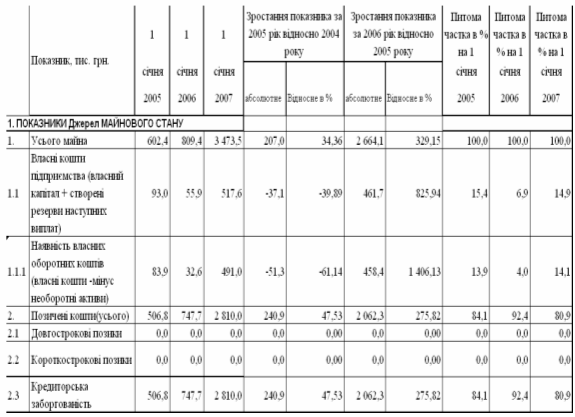 Рисунок 2.2 - Динаміка структури майна(активів) ТОВ “Олімп” Таким чином, у 2004 - 2006 роках для активів підприємства характерні процеси різкого нарощування запасів за рахунок практично повного використання грошових коштів підприємства, при цьому 54,7% активів займає дебіторська заборгованість за реалізовану продукцію, а 41,6% активів – запаси, тобто циклічне функціонування підприємства залежить від активності надходження коштів за реалізовану продукцію для придбання в запаси наступної партії продукції, яка, в основному, імпортується з-за кордону та реалізується оптом на Україні. Вказане накоплення запасів пов’язане з зростанням обсягів заказів продукції та закупленням і ввезенням(імпортуванням) її ТОВ “Олімп” на територію України з темпом, який випереджає темп реалізації. Імпортовані комплекти меблів виставляються в колекціях меблевих салонів для залучення покупців, які бачать реальну продукцію та можливість її миттєвої доставки. Таблиця 2.2 - Динаміка джерел ресурсів підприємства ТОВ “Олімп”