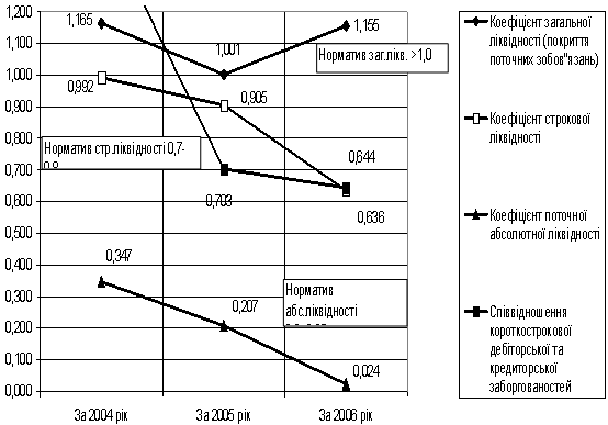Рисунок 2.6 - Динаміка показників ліквідності балансу ТОВ “Олімп” Аналіз графіків показників ліквідності, наведених на рисунку 2.6, показує : - у 2004-2005 роках всі нормативи ліквідності балансу в ТОВ “Олімп” знаходились в нормативному діапазоні стійкого ліквідного стану підприємства; - у 2006 році різко знизився до нуля показник абсолютної ліквідності та став нижче нормативного діапазону показник строкової ліквідності; - у 2005 – 2006 роках показник відношення короткострокової дебіторської та кредиторської заборгованостей був суттєво нижче значення стійкого діапазону (більше 1,0), тому для розрахунків з кредиторами необхідно було не тільки отримати кошти дебіторської заборгованості за відпущені товари, але і розраховуватися частиною власних оборотних коштів (оборотна частина капіталу); Таким чином, у 2006 році підприємство попало в кризову полосу неліквідності балансу в короткострокових періодах, що зафіксовано у раніше вказаному факті використання у 2006 році всієї грошової маси на закупівлю товарних запасів.
