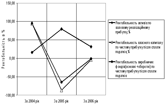 Рисунок 2.7 - Динаміка рентабельності активів та власного капіталу підприємства ТОВ “Олімп” Аналіз показників ділової активності (Додаток Е) та рентабельності активів і власного капіталу ТОВ “Олімп” (рисунок 2.7) показує: 1. Ресурсовіддача активів в чисту виручку зросла з рівня 2,26 (2004) до 11,76 у 2005 році та зменшилась до рівня 4,8 у 2006 році; 2. Рентабельність активів та власного капіталу по валовому прибутку від реалізації ( різниця між чистим доходом та собівартістю продукції) є позитивною та має високі значення. 3. Витрати на реалізацію та інші статті позареалізаційних витрат, які не входять до виробничої собівартості продукції, у 2005 - 2006 році перевищують валовий реалізаційний прибуток (Додаток Г), що приводить до збиткової діяльності по показнику загального операційного прибутку. Тому рентабельність активів та власного капіталу у 2005 - 2006 роках негативна чи близька до нульового рівня. На рисунку 2.8 наведена динаміка показників ділової активності (швидкості обороту окремих характерних агрегатів активів та пасивів балансу) ТОВ “Олімп”.