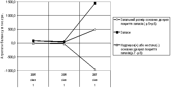 Рисунок 2.9 - Динаміка показників покриття запасів джерелами ресурсів в ТОВ “Олімп” Як видно з графіків рисунку 2.9 : - якщо у 2004 році джерел покриття запасів було досить для покриття запасів (абсолютно стійкий фінансовий стан), то у 2005 році джерел покриття запасів стало недоставати (дефіцит = -24 тис.грн.) і підприємство перемістилося в зону нестійкого фінансового стану; - у 2006 році з різким нарощенням запасів, джерел покриття запасів (власний капітал + довгострокові кошти + банківські кредити) стало недоставати на значно більшу суму(дефіцит = - 955 тис.грн.), перевищуючу власний капітал підприємства, відповідно фінансової стійкості ТОВ “Олімп” по покриттю запасів характеризується як кризовий. У закордонній практиці поширення придбала модель прогнозування банкрутства — Альтмана [36,с.68], яка була розроблена в 1968 році і відома також за назвою «розрахунок Z-показника» — інтегрального показника рівня погрози :
