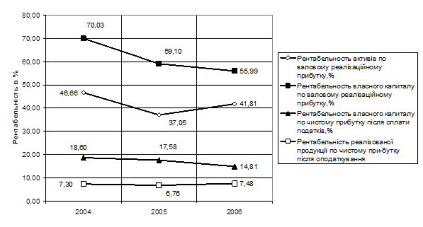 Рис.2.2. Динаміка рентабельності активів та власного капіталу підприємства ВАТ „Київмедпрепарат” Аналіз рентабельності активів та власного капіталу ВАТ „Київмедпрепарат” показує, що діяльність може бути охарактеризована наступним рівнем динаміки показників: 1. Ресурсовіддача активів в чисту виручку знизилась з рівня 1,34 (2004) до 1,22 у 2005 році та зменшилась до рівня 1,10 у 2006 році; 2. Рентабельність активів та власного капіталу по валовому прибутку від реалізації ( різниця між чистим доходом та собівартістю продукції) є позитивною, має високі значення, але і тенденцію до падіння у 2005 – 2006 роках відносно рівня 2004 року. 2. Витрати на реалізацію та інші статті позареалізаційних витрат, які не входять до виробничої собівартості продукції, у 2005 -2006 році складають до 93% від чистої вартості виручки від реалізації, що дає стійку норму рентабельності власного капіталу по чистому прибутку на рівні 18% (2004 –2005) та 14,8%(2006), яка є інвестиційно привабливою на рівні альтернативних ставок банківських депозитів у 2006 році.. На рис.2.3 наведені характеристики ділової активності (швидкості обороту окремих характерних агрегатів активів та пасивів балансу) ВАТ „Киівмед-препарат”.