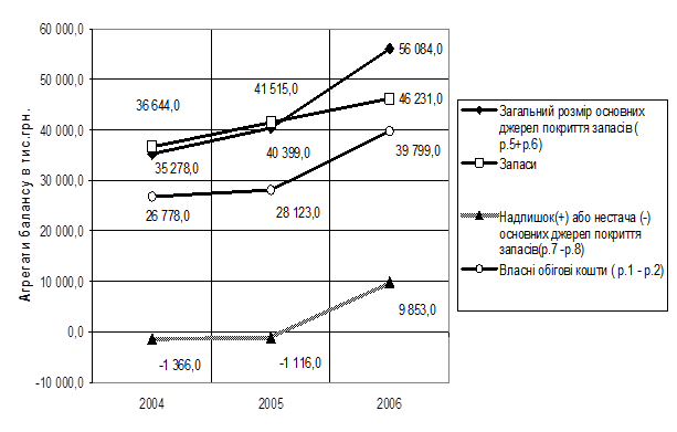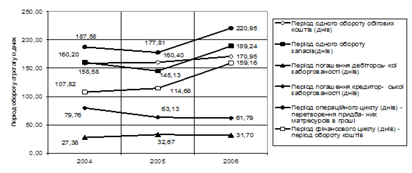 Рис. 2.3. Характеристики динаміки показників ділової активності ВАТ „Київмедпрепарат” Як показано графіками рис.2.3, у 2006 році відносно 2004 - 2005 року з нарощенням обсягів операцій період обороту запасів балансу підвищився на 30,9%, що підняло відповідно строк фінансового та операційного циклу та свідчить про зниження темпів ділової активності підприємства при нарощенні обсягів діяльності. В той же час, слід відмітити, що строк обороту дебіторської заборгованості в 2 рази менший, ніж строк обороту кредиторської заборгованості, що компенсує невиконання нормативу відношення дебіторської до кредиторської заборгованостей . На рис.2.4 наведені результати аналізу джерел покриття запасів в ВАТ “Київмедпрепарат”.